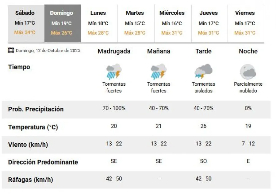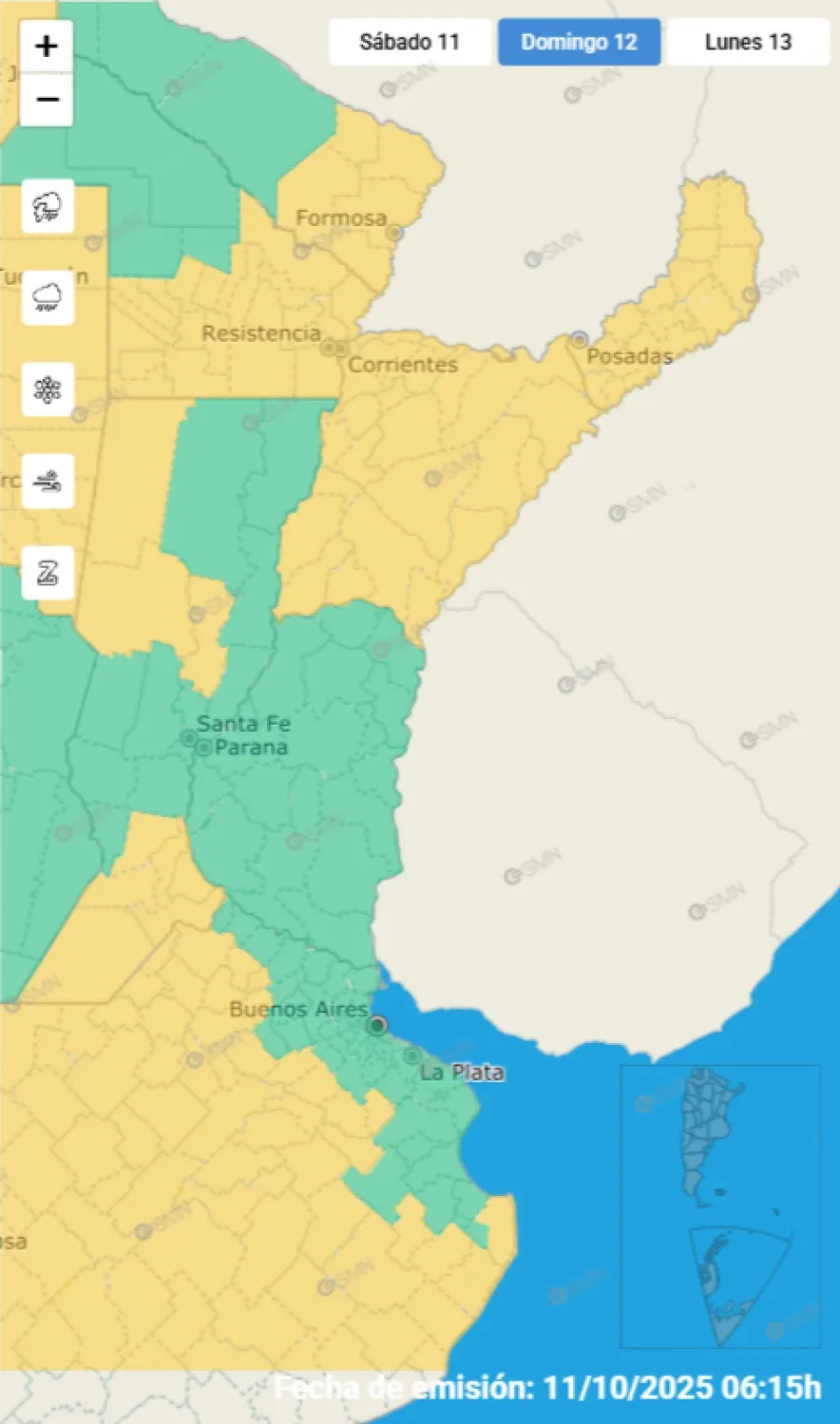 El Servicio Meteorológico Nacional (SMN) emitió una alerta amarilla por tormentas que abarca a toda la provincia de Corrientes para el domingo 12 de octubre. Según el organismo, se prevén tormentas fuertes durante la madrugada y la mañana, con posibilidad de ráfagas intensas, actividad eléctrica, ocasional caída de granizo y abundante caída de agua en cortos períodos.