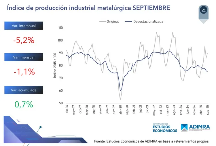 Durante septiembre de 2025, la actividad metalúrgica registró una caída interanual del 5,2% y una disminución de 1,1% respecto al mes pasado, acumulando un crecimiento de sólo un 0,7% durante el año. De esta manera, la producción muestra signos de estancamiento y se estaciona en niveles muy bajos: 18% por debajo de sus niveles máximos recientes y 30% por debajo de sus picos históricos.