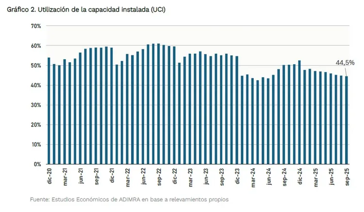 El informe elaborado por el Departamento de Estudios Económicos de la Asociación de Industriales Metalúrgicos de la República Argentina (ADIMRA) señala que la utilización de la capacidad instalada (UCI) registró una caída de -5,6 puntos porcentuales con respecto al mismo mes del año previo, continuando así su pendiente decreciente cada mes y se encuentra en uno de los valores más bajos en términos históricos llegando a 44,5% similares a marzo-junio de 2020 en pandemia.