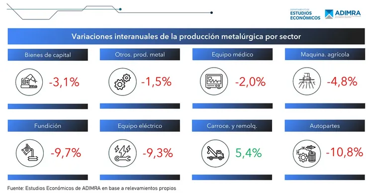Autopartes (-10,8%), Fundición (-9,7%) y Bienes de Capital (-3,1%) mantuvieron un desempeño negativo, consolidando un escenario complejo y sin señales de recuperación. Estos rubros continúan siendo los principales focos de debilidad dentro del entramado metalúrgico.