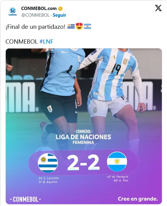 En la segunda fecha de la Liga de Naciones Femenina de la Conmebol, el equipo dirigido por Germán Portanova, que venía de vencer 3-1 a Paraguay en su debut, logró empatar sobre el final y mantener el liderazgo en el torneo clasificatorio rumbo al Mundial 2027.