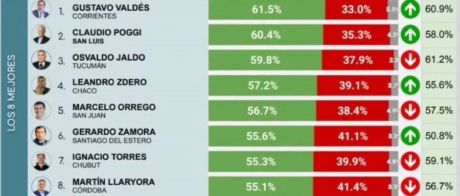 En el segundo lugar aparece Claudio Poggi (San Luis) con 60,4% positivo y en el tercero Osvaldo Jaldo (Tucumán) con 59,8%. El Top 5 lo completan Leandro Zdero (Chaco) con 57,2% y Marcelo Orrego (San Juan) con 56,7%.