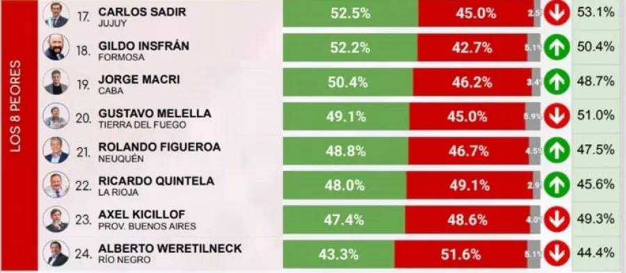 En la mitad de la tabla figuran Rogelio Frigerio (Entre Ríos), Maximiliano Pullaro (Santa Fe), Alfredo Cornejo (Mendoza), Claudio Vidal (Santa Cruz), Raúl Jalil (Catamarca) y Gustavo Sáenz (Salta), con porcentajes de imagen positiva que se mantienen por encima del 52%.