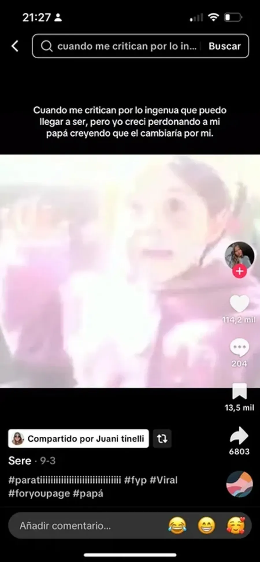 "Cuando me critican por lo ingenua que puedo llegar a ser, pero yo crecí perdonando a mi papá creyendo que él cambiaria por mí", acotó la joven en otro video de Tik Tok donde no se explayó en los motivos de su alejamiento.