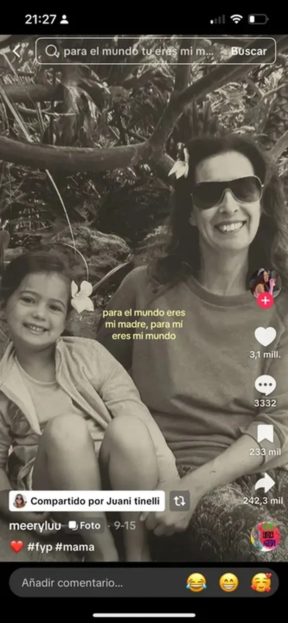 "Para el mundo eres mi madre, para mí eres mi mundo", expresó Juanita con una foto de archivo de ella y la segunda esposa de Marcelo Tinelli.