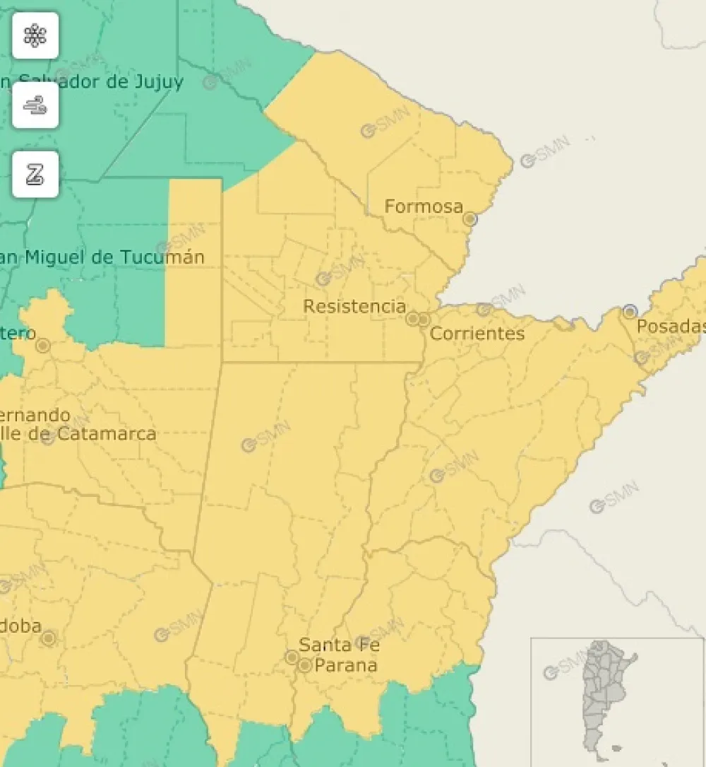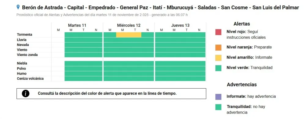 SERVICIO METEOROLÓGICO NACIONAL. El Servicio Meteorológico Nacional informó sobre alerta amarilla por tormentas fuertes para Capital y todas localidades del interior de la provincia de Corrientes, durante la jornada del miércoles.