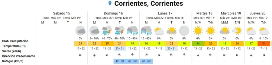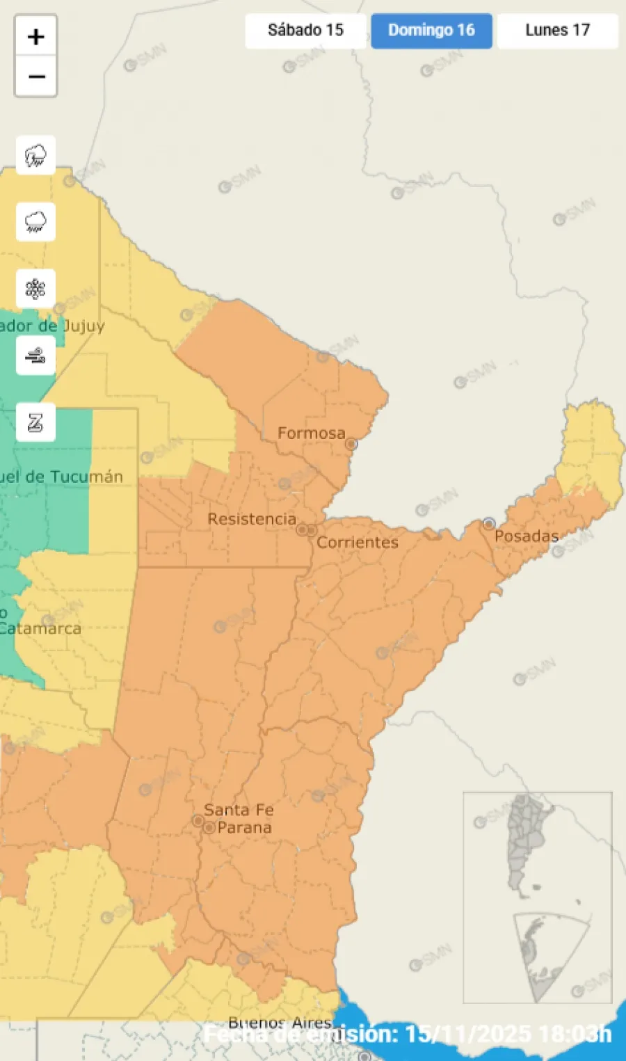 El mapa oficial muestra que Corrientes quedará bajo alerta naranja durante la jornada del domingo 16. Durante dicha jornada, el SMN anticipa la formación y desarrollo de tormentas desde la madrugada, con mayor actividad durante la mañana y la tarde. Las probabilidades de precipitación se ubican entre 40% y 70% en los momentos de mayor intensidad.