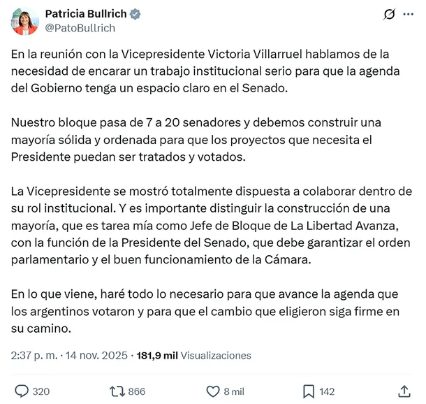 “En la reunión con la vicepresidente Victoria Villarruel hablamos de la necesidad de encarar un trabajo institucional serio para que la agenda del Gobierno tenga un espacio claro en el Senado”, aseveró Bullrich en X.