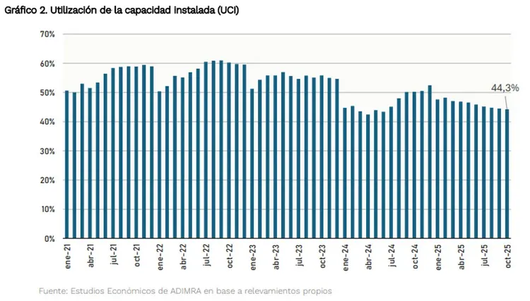 Adimra informó, además, que el sector se encuentra un -17,7% por debajo de sus niveles máximos recientes. El uso de la capacidad instalada continúa con su caída constante: es del 44,3% similar a marzo-junio de 2020 en pandemia.