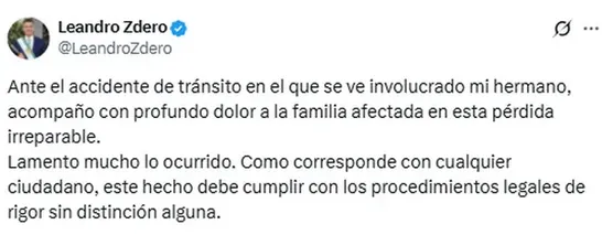 Tras conocerse lo sucedido, el gobernador de Chaco escribió en su cuenta de X: "Ante el accidente de tránsito en el que se ve involucrado mi hermano, acompaño con profundo dolor a la familia afectada en esta pérdida irreparable. Lamento mucho lo ocurrido", comenzó indicando.
