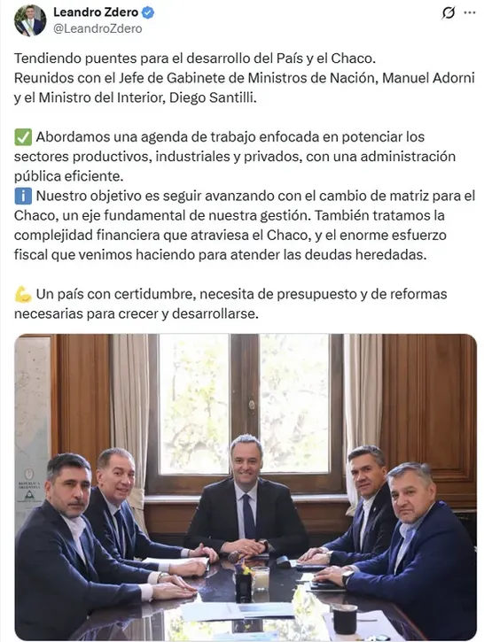 “Tendiendo puentes para el desarrollo del País y el Chaco”, anunció Zdero a través de su cuenta en la red social X donde amplió algunos de los temas que se trataron en la reunión: “Abordamos una agenda de trabajo enfocada en potenciar los sectores productivos, industriales y privados, con una administración pública eficiente”, detalló.