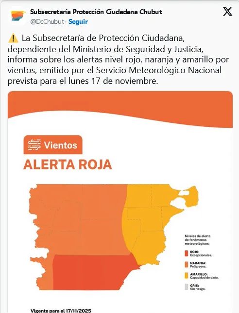 El gobernador de Chubut, Ignacio Torres, compartió a través de sus redes sociales el anuncio sobre los alertas nivel rojo, naranja y amarillo emitidos por el Servicio Meteorológico Nacional para este lunes, 17 de noviembre, por fuertes vientos.