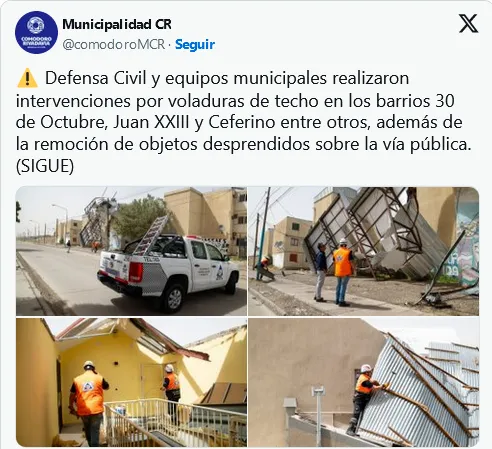 Durante la tarde del lunes se registraron destrozos, voladura de techos y caída de árboles, postes y otros elementos de infraestructura en ciudades como Comodoro Rivadavia, lo que motivó a las autoridades a proveer al público de una línea de emergencia:
