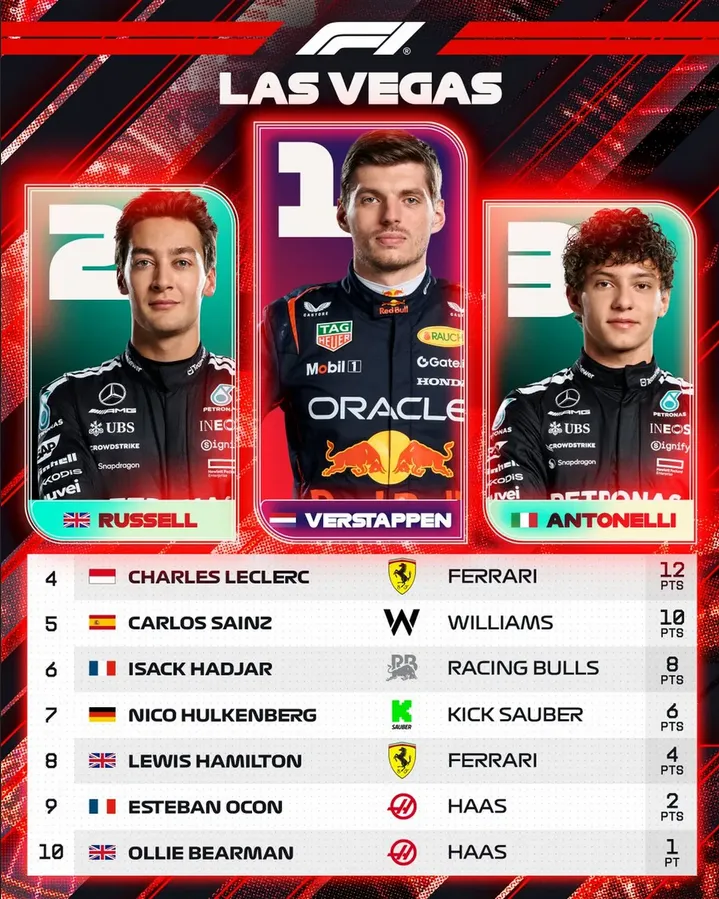 Detrás se habían ubicado los británicos Lando Norris (McLaren), líder del campeonato, y George Ruseell (Mercedes). Y en cuarto lugar, el australiano Oscar Piastri (McLaren). Sin embargo, la situación cambió horas más tarde, ya que Norris y Piastri fueron descalificados.