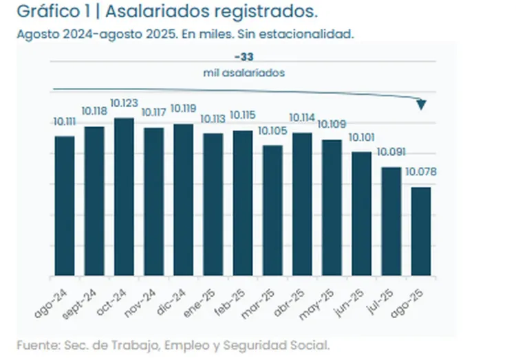 El trabajo, coordinado por Roxana Maurizio y Luis Beccaria y elaborado por el Área de Empleo, Distribución e Instituciones Laborales (EDIL) del IIEP, muestra que en agosto de 2025 el empleo asalariado formal registró una pérdida de 13.100 puestos de trabajo, con 10.600 en el sector privado y 1.700 en el público, mientras que el empleo en casas particulares se mantuvo estable.En términos interanuales, la caída representa 33 mil puestos de trabajo menos respecto a agosto de 2024 (-0,3%) y 224 mil menos desde noviembre de 2023 (-2,2%), ubicando el nivel de empleo formal en valores similares a octubre de 2022.