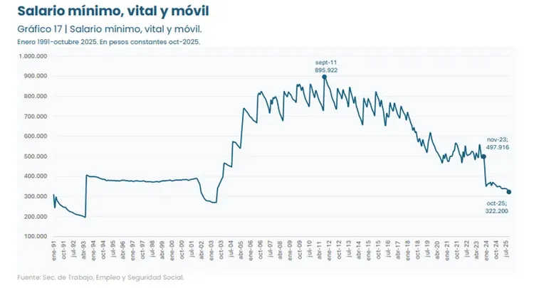 El informe también advierte sobre la caída del poder adquisitivo del SMVM: en los últimos meses, el salario real descendió 0,5% en julio y agosto, 2% en septiembre y 2,3% en octubre de 2025. Desde noviembre de 2023, el salario mínimo real acumuló una contracción del 35%, ubicándose actualmente por debajo del valor de 2001 y con una erosión del 64% respecto de su máximo histórico en septiembre de 2011.